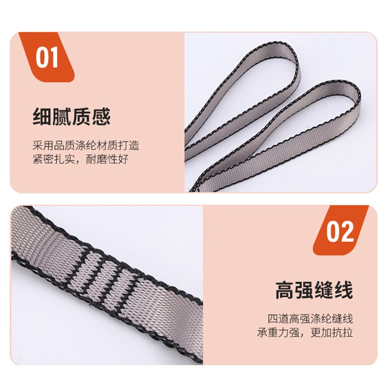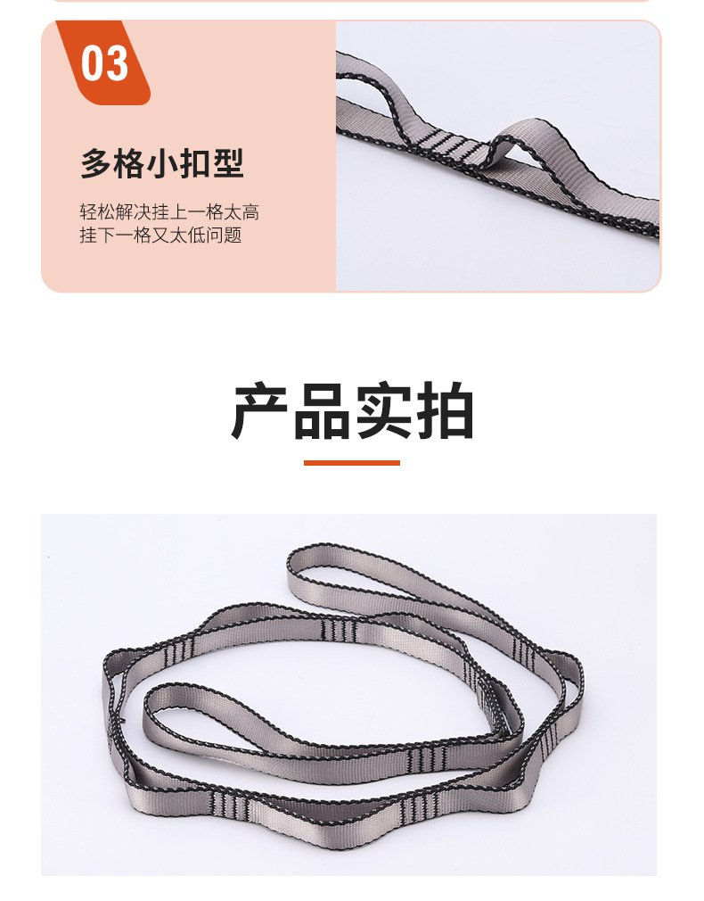 空中瑜伽吊床延長織帶,伸展帶,高強度登山菊繩吊帶。細膩質感:滌綸材質緊密扎實,耐磨性好。高強縫線:四道高強滌綸縫線承重力強,更加抗拉。多格小扣型:輕松解決掛上一格太高,掛下一格又太低問題。